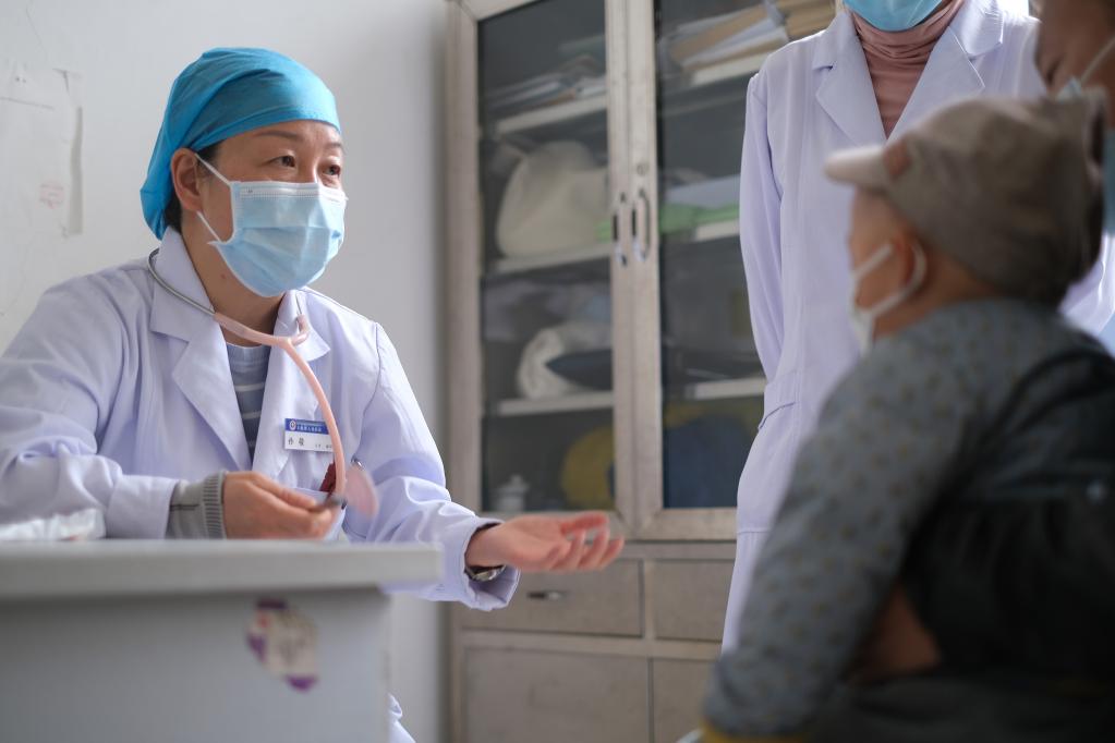 2022年4月25日,青海省妇女儿童医院医生、青南支医队员孙敬(左一)在青海省玉树藏族自治州人民医院儿科门诊坐诊。新华社记者 韩方方 摄