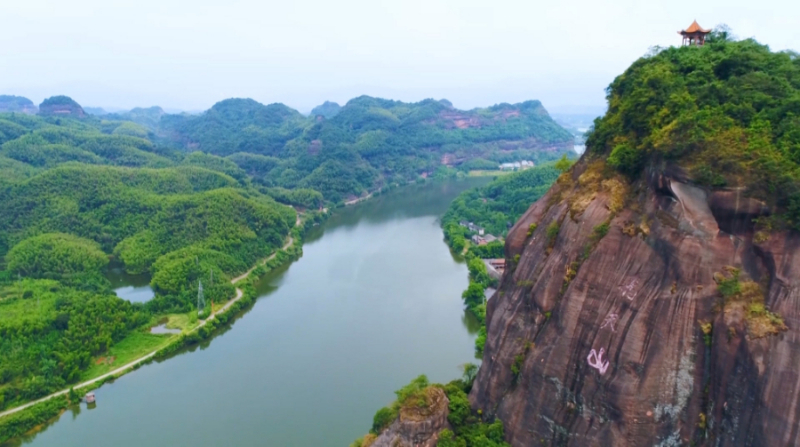 郴州飞天山国家地质公园属典型的丹霞地貌,位于湖南省郴州市苏仙区境内,是国家AAAA级旅游景区。飞天山集山、水、林、洞为一体,融雄、奇、险、秀、巧于一身。这里丹峰林立,红岩绿水,奇石幽洞,翠江柔情。(刘昱 周宇)