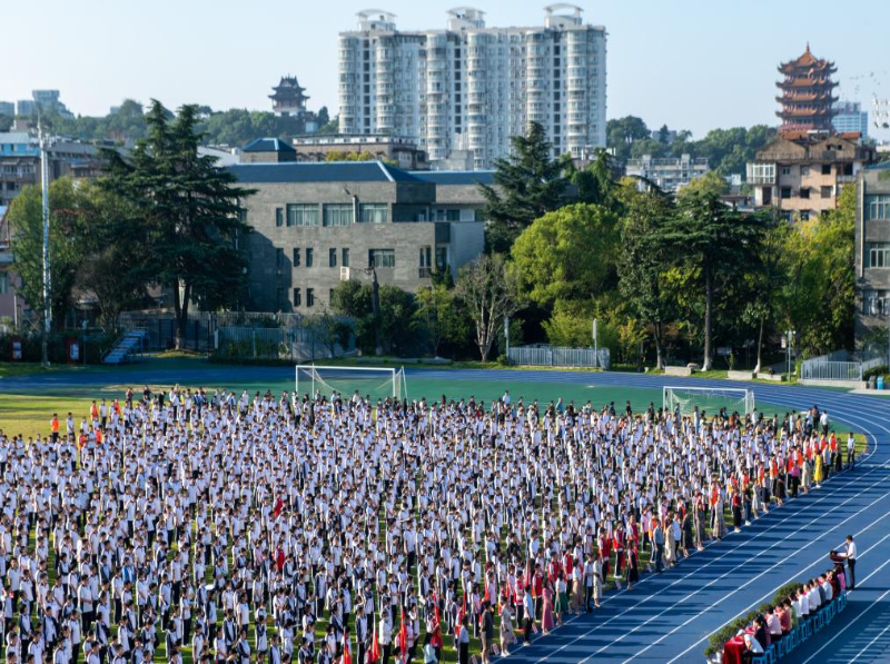 湖北省武昌实验中学师生在参加开学典礼。(杜子璇 摄)
