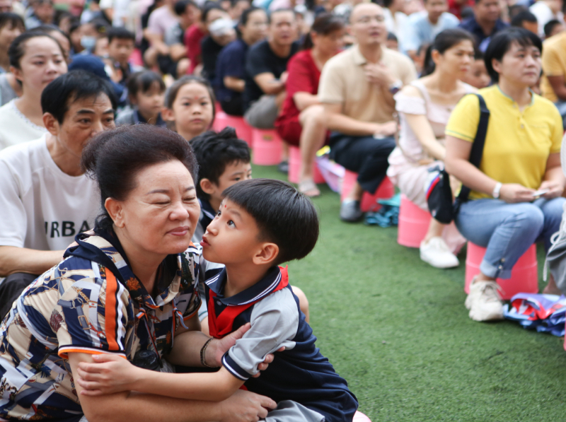 海口市玉沙实验学校一年级新生和家长在“开笔礼”仪式活动现场。新华社记者樊雨晴 摄