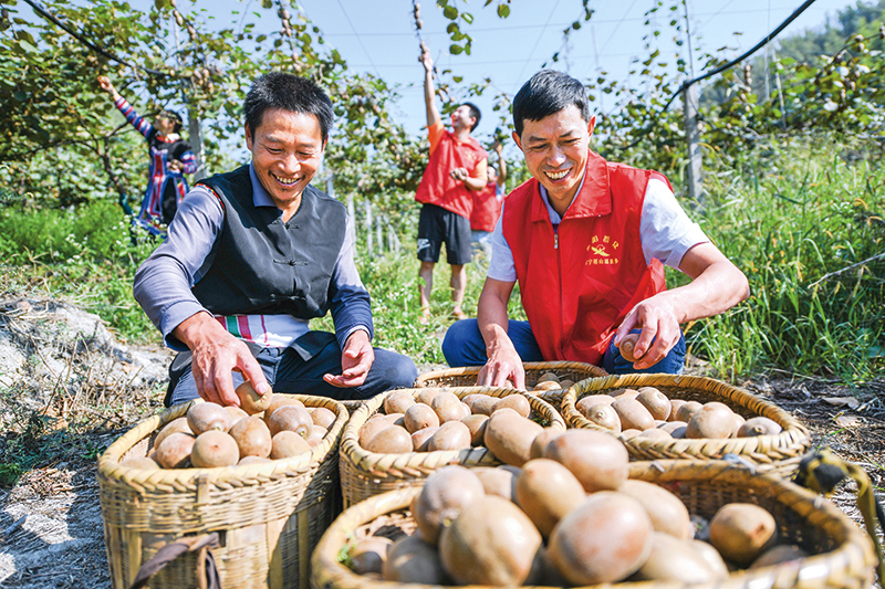 湖南省衡阳市党员干部在常宁市塔山瑶族乡阳山村帮助村民采摘猕猴桃(2023年9月摄) 周秀鱼春摄