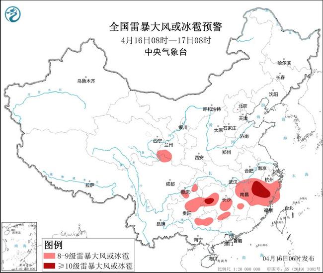 预计4月16日08时至17日08时,甘肃南部、安徽南部、湖南中西部和南部、江西中北部、浙江中南部、福建北部、四川北部、重庆中南部、贵州中北部、广西北部等地的部分地区将有8-10级雷暴大风或冰雹天气,局地可达11级以上;安徽南部、湖北西部和东南部、湖南中北部、江西中北部、浙江中南部、福建西北部、四川东北部、重庆、贵州中东部、广西东北部等地的部分地区将有短时强降水天气,最大小时雨量30-60毫米,局地可达70毫米以上。
