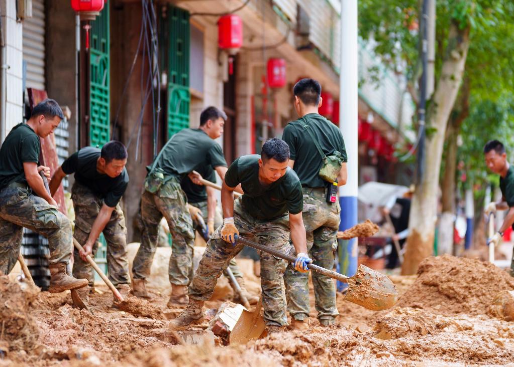 8月1日,武警湖南总队郴州支队官兵对资兴市八面山瑶族乡018县道进行清淤任务,帮助当地群众恢复道路交通。  新华社发(张森 摄)