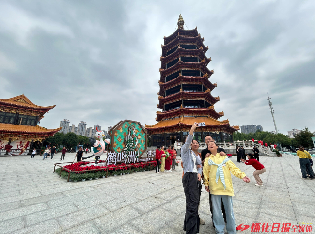 (游客在鹤鸣洲打卡拍照 全媒体记者 李青青 摄)