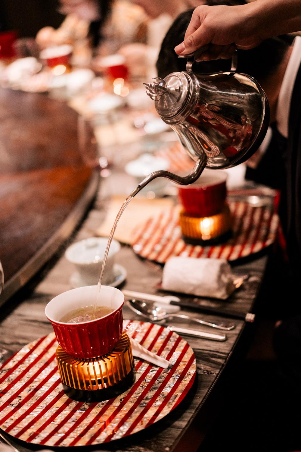 品鉴宴上,前菜“雪影椒香鲍参脯”开启风雅序章;“山湖椒清汤灼牛肉”依古法煨制,汤清味醇;“橙香蟹影”循马王堆食典,风味一新;“草绿韭香原汁羔羊排”承袭古宴温补智慧;“梅菜黑豚土猪肉蝴蝶夹”仿汉时食器之形,内藏浓郁肉香;“米汤灼无骨鲫鱼”则以古法米汤衬托鱼鲜本真。宴末以“红枣汁藕粉丸子榴莲心”与“山茶花糕水果拼”收尾,循古法熬制枣汁,再以山茶点睛,余味绵长……