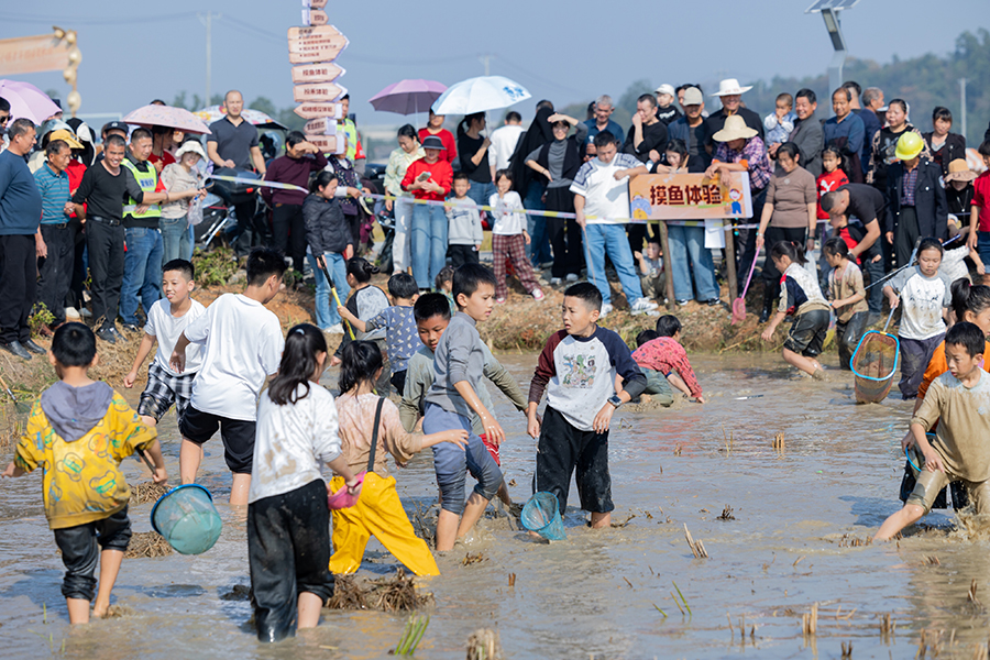 沿田埂蜿蜒而行,下田摸鱼、稻穗插花、游船赏景、非遗展演等丰富多彩的田园体验与文化活动第次展开,游客们挽袖卷衣,乐在其中。“宁飨好物”小镇集市全天开放, 40个摊位整齐排列,金洲大米、宁乡四小碟、手工红薯粉等特色农产品现买现尝,新鲜采摘的蔬菜、刚出炉的农家糕点散发着自然香气;非遗糖画、“宁造物”手作、竹编工艺品等文创产品琳琅满目,尽显乡土匠心。