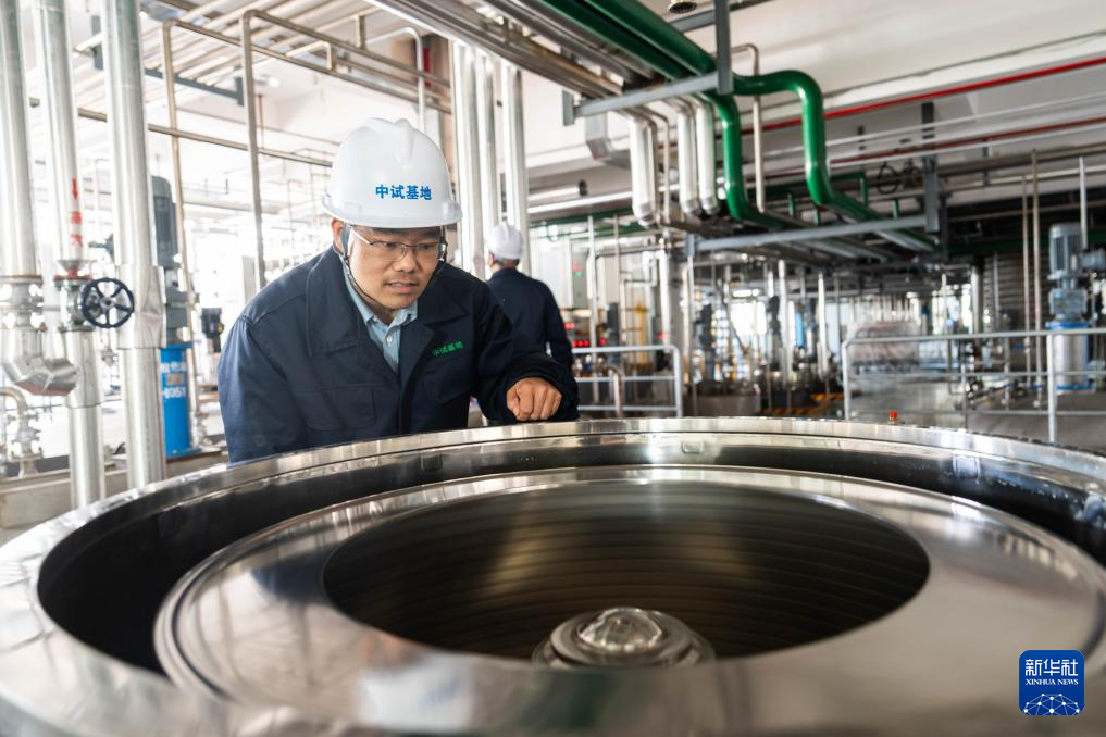 12月1日,在津市高新区的湖南生物制造中试基地发酵液提纯车间,工作人员使用平板离心机进行物料脱水作业。新华社记者 陈思汗 摄