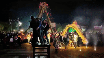 郴州汝城县居民舞动已点燃的“香火龙”(资料照片)。游走在古村之中,