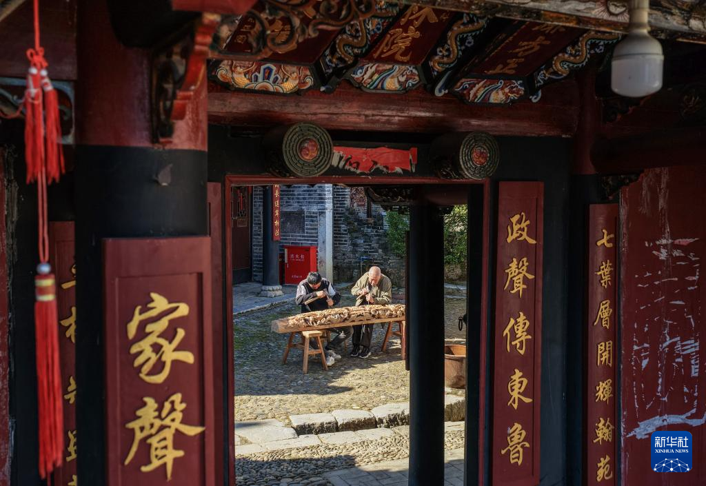 11月24日,祖孙两代木雕技艺省级非物质文化遗产代表性传承人、80岁的傅德雄(右)与35岁的傅航(左)在郴州汝城县金山村叶氏家庙(敦本堂)内刻木雕。叶氏家庙(敦本堂)于2013年被列为全国重点文物保护单位。新华社记者 刘莲芬 摄pagebreak