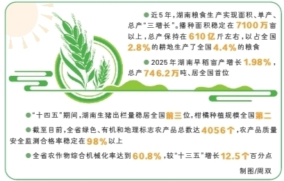 湖南是全国13个粮食主产省份之一,水稻播种面积、总产量均居全国第一位。“十四五”期间,全省“五级书记”重粮抓粮,通过藏粮于地、藏粮于技,推进“良田良种、良机良法”四良融合,全方位夯实粮食安全根基,稳稳地扛起了维护国家粮食安全的重任。
