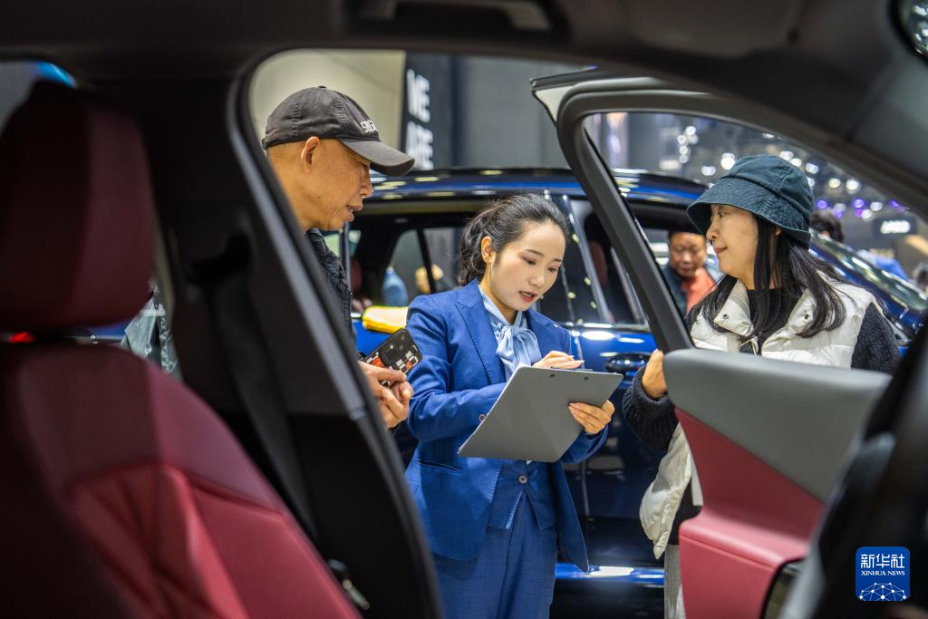 12月10日,观众(右一)在了解参展车辆。新华社记者 陈思汗 摄pagebreak